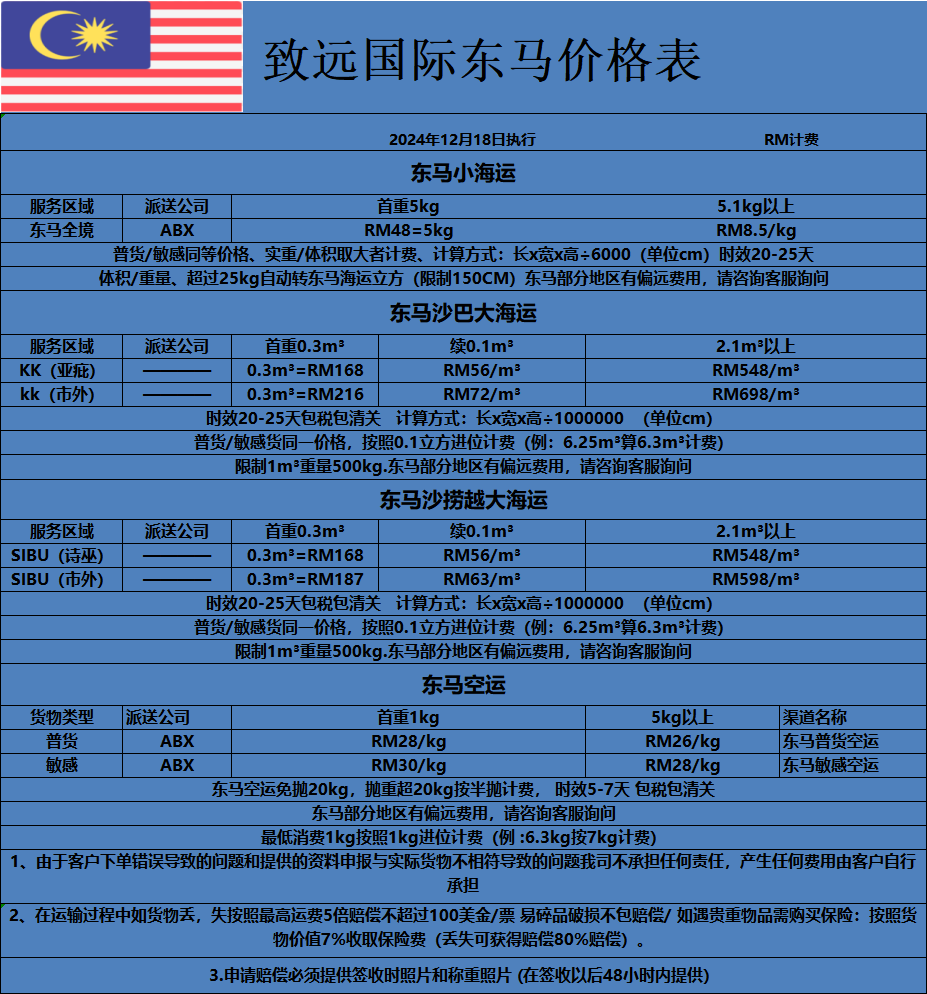 东马运费报价2024年12月18日执行